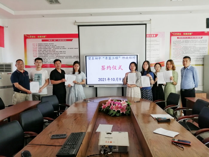 为加快新入职青年教师队伍建设,充分发挥骨干教师的“传、帮、带”的模范作用,10月9日,望直港镇中心初中在小会议室举行“青蓝工程”师徒结对签约仪式。教科室李延楼主任主持仪式,副校长马伟强、张法平等领导参会。