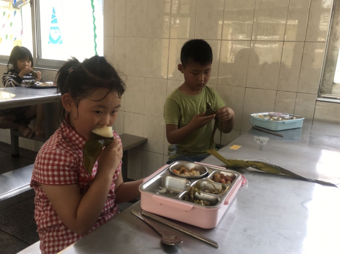 6月1日下午,宝应县城南小学组织部分党员教师与留守儿童在食堂包粽子,迎接端午佳节的到来。