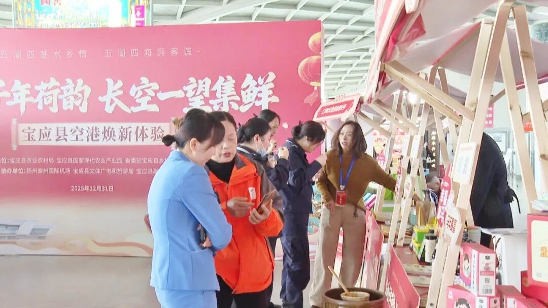 2025年12月31日,“宝地千年荷韵·长空一望‘集’鲜”宝应县空港推介活动在扬州泰州国际机场候机大厅正式启幕。县委常委、副县长、省委驻宝应县乡村振兴工作队队长薛刘宇等出席。活动将宝应当季风物与非遗文化“搬”入航站楼,让往来旅客在云端之下,率先品味“荷乡”宝应的地道风物与人文底蕴。