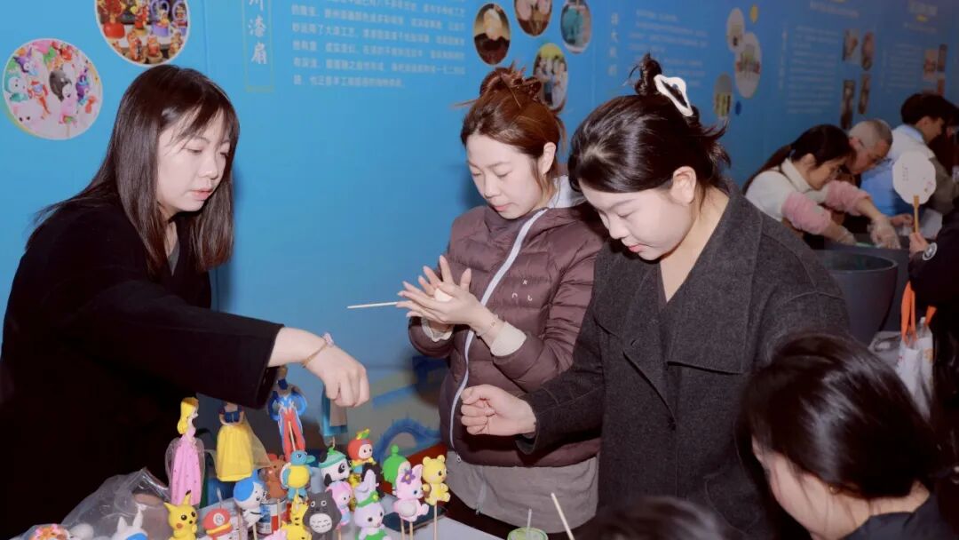 非遗文化美食展区内,漆扇、绒花、剪纸等扬州非遗项目依次陈列,扬大酸奶、莲藕制品等淮扬风味美食同步呈现,吸引众多学子驻足观赏、品鉴体验。本次活动还创新设计“沉浸式”NPC互动体验——学子参与面试或者体验非遗可收集“银票”兑换扬州文创与美食,在趣味互动中深度感知扬州的城市魅力。