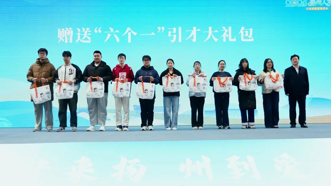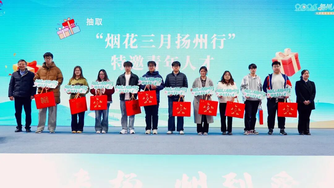 为表达对天津学子的满满诚意和真挚邀约,现场为学子代表赠送“六个一”引才大礼包,并抽取10名“烟花三月扬州行”特邀青年人才,送出交通券、早茶券、旅游券、人才公寓免费入住券、足球演唱会门票、非遗礼品和文创产品。